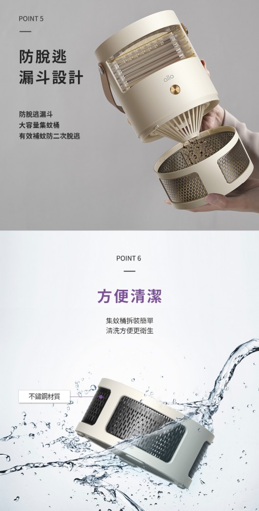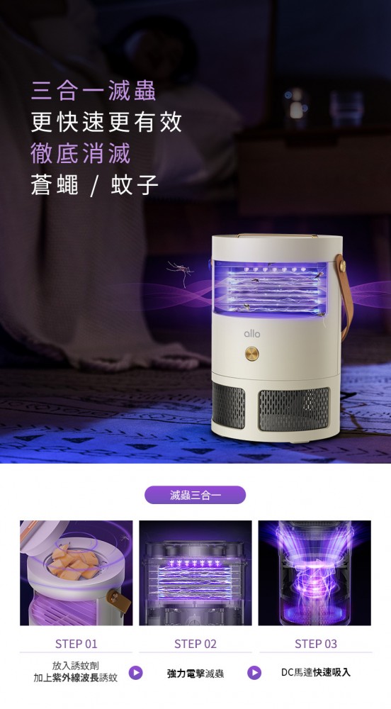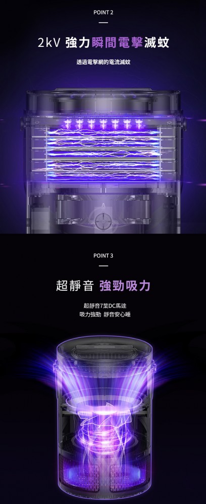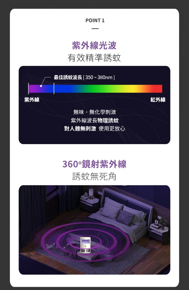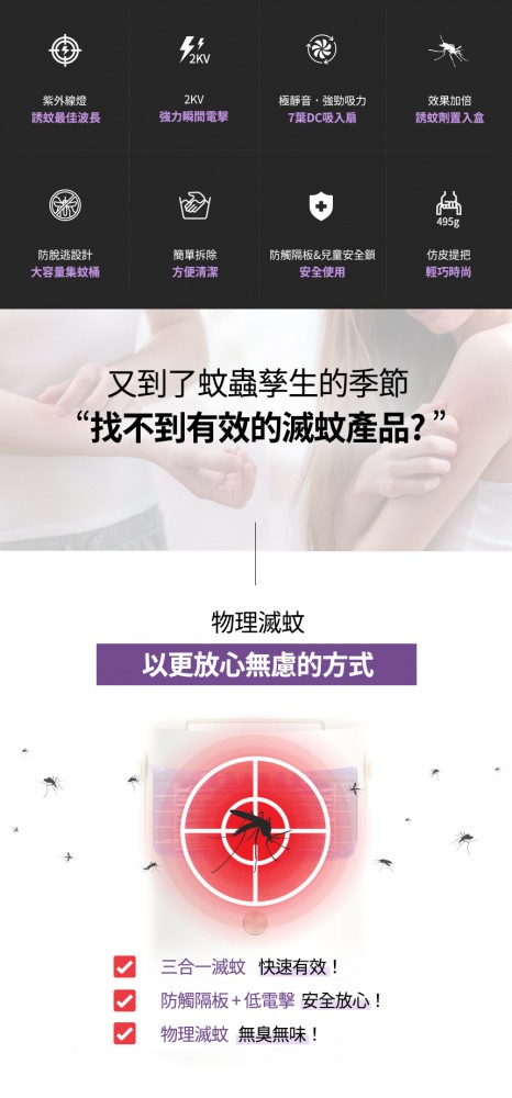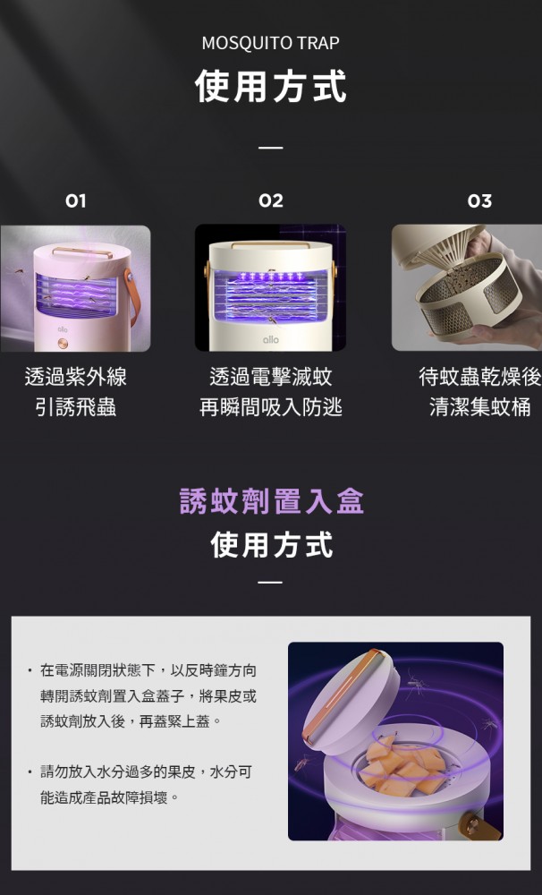 【三合一】紫外線、電擊、吸入三合一強效滅蚊 【時尚】韓系質感時尚設計 【高效】最佳引蚊紫外線波長350~380nm,鏡面反射照射無死角 【極靜】極靜DC吸入扇,強力吸入每隻蚊蟲 【天然】附誘蚊劑置入盒,果皮誘蚊效果加倍 【防逃】可拆式防脫逃網,輕鬆維持清潔 【安全】安心升級!防觸隔板、防童安全鎖